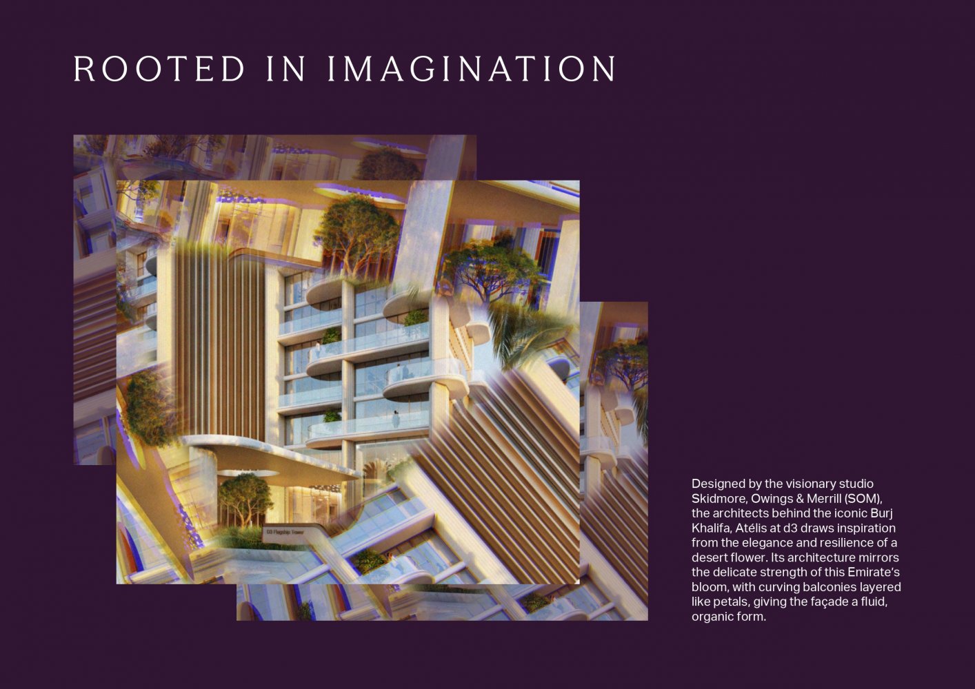 Atélis at d3 wurde von den renommierten Architekten Skidmore, Owings & Merrill (SOM), den Schöpfern des Burj Khalifa, entworfen. Dieses Wohnmeistersbild spiegelt die elegante Stärke einer Wüstenblume wider, mit geschwungenen Balkonen, die zarte Blütenblätter ähneln. Die Residenzen bieten großzügige Wohnflächen mit hochwertigen Ausstattungen und eleganten Designs. Jede Wohnung ist sorgfältig gestaltet, um ein gehobenes Wohnerlebnis mit ruhigen Innenräumen zu bieten, die warme natürliche Töne und luxuriöse Details umfassen. Die Bewohner genießen den Zugang zu modernen Annehmlichkeiten, darunter Wellnessräume, Gärten und ein Infinity-Pool mit Blick auf die ikonische Skyline von Dubai.