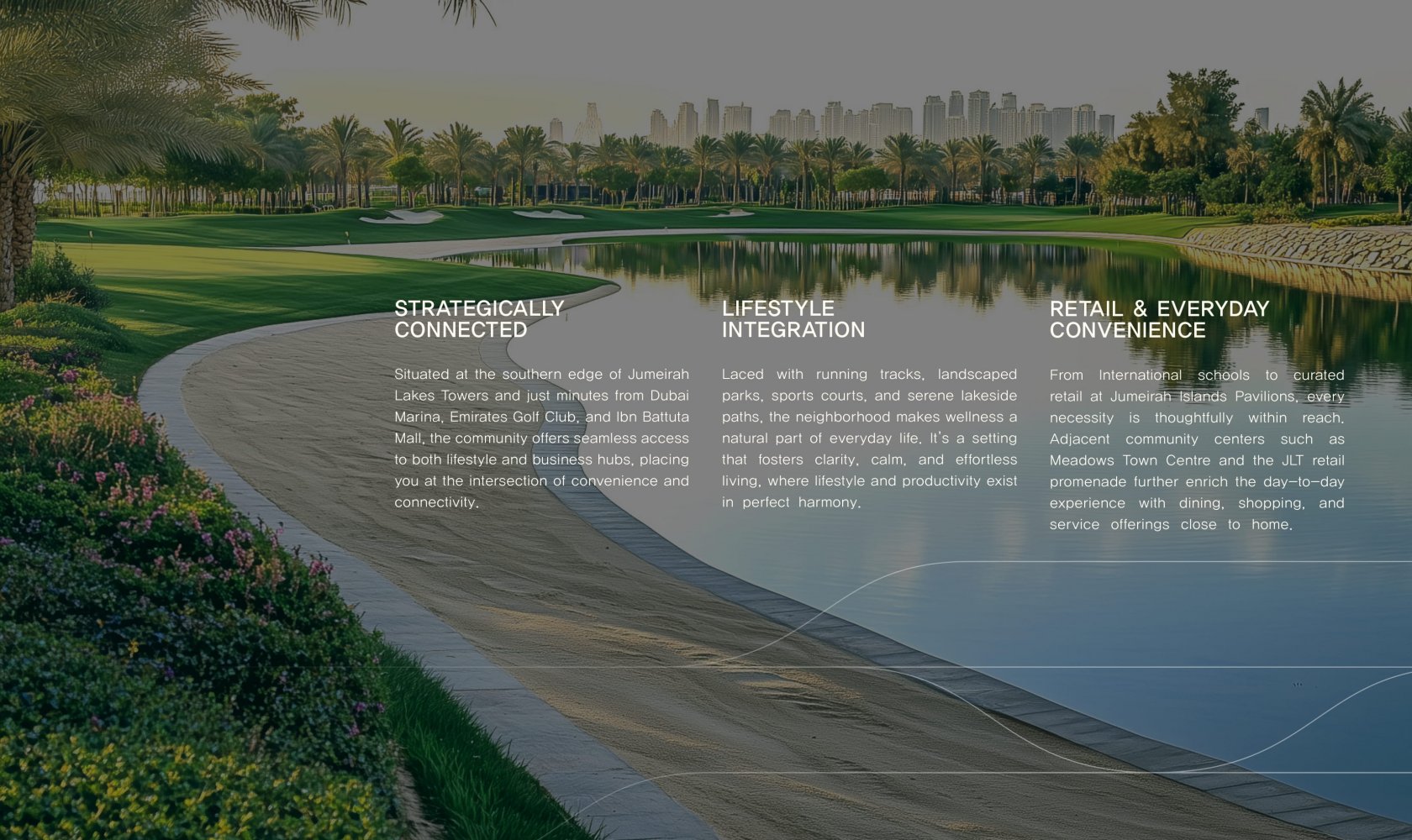 Esta comunidad de alto nivel ofrece una amplia gama de servicios, incluyendo parques paisajísticos, pistas para correr, canchas deportivas y senderos junto al lago que fomentan un estilo de vida activo y saludable. Las residencias cuentan con plazas de aparcamiento dedicadas, estaciones de carga para vehículos eléctricos, estacionamientos para bicicletas con talleres de reparación y fácil acceso a tiendas como Jumeirah Islands Pavilion y Meadows Town Centre. Los residentes disfrutan de clubhouses privados, piscinas infinity, estudios de fitness, clubes infantiles, estudios de yoga y boxeo, spas y salones de bienestar, saunas, baños de vapor, espacios verdes al aire libre y áreas sociales comunes, diseñados para ofrecer una experiencia de vida tranquila y vibrante.