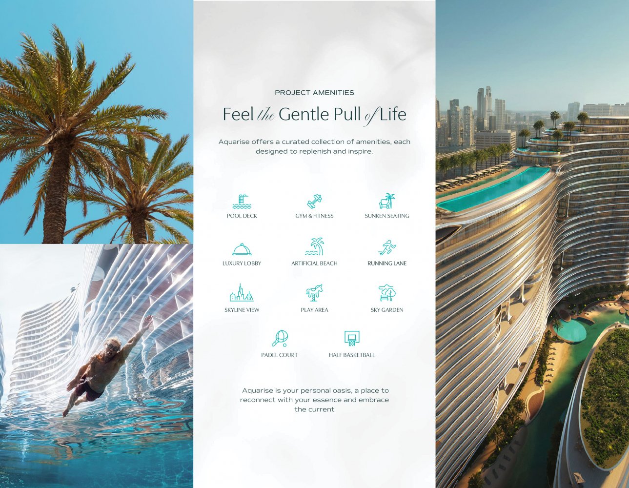 Aquarise est bien plus qu’un simple lieu de vie; c’est un sanctuaire où le temps ralentit et où la richesse de la vie se redécouvre. L’intégration harmonieuse de pratiques de construction durables et de fonctionnalités écoénergétiques souligne l’engagement de Binghatti envers un artisanat responsable.