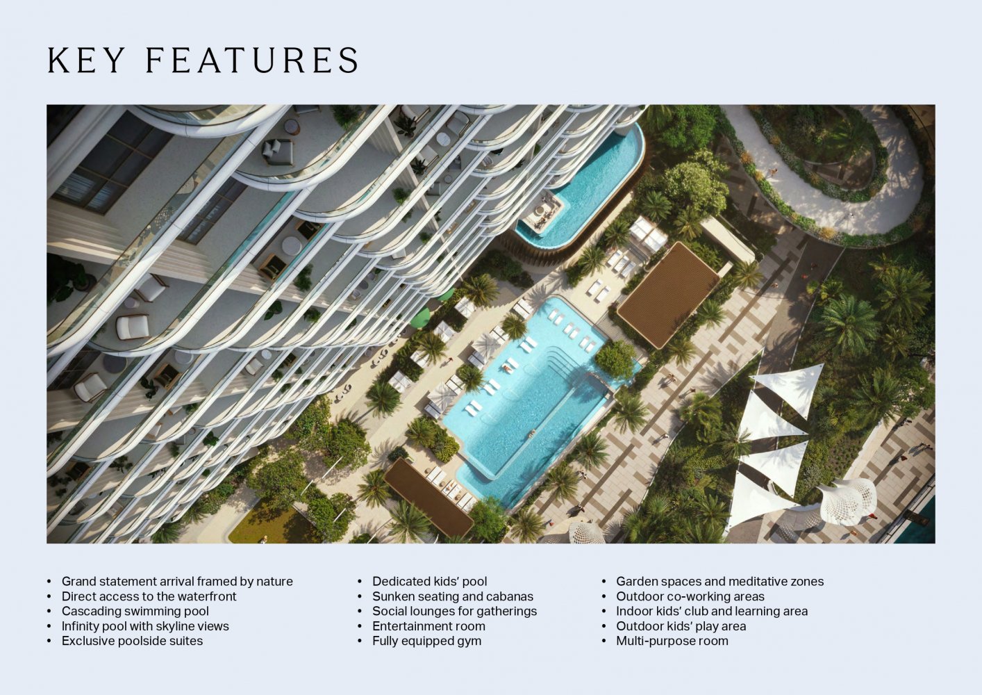Queste residenze esclusive offrono servizi di prima classe, incluso l'accesso diretto all'acqua e piscine a cascata. I servizi di lusso includono aree di seduta abbassate, cabine, lounge sociali per riunioni e una palestra completamente attrezzata. Una piscina per bambini dedicata e un'area giochi, insieme a un club per bambini e una zona di apprendimento, creano un'atmosfera adatta alle famiglie. La proprietà dispone anche di spazi di coworking all'aperto e una sala intrattenimento. Ai piani superiori, una piscina a sfioro e giardini tranquilli offrono ai residenti un luogo per rilassarsi e rinnovarsi.